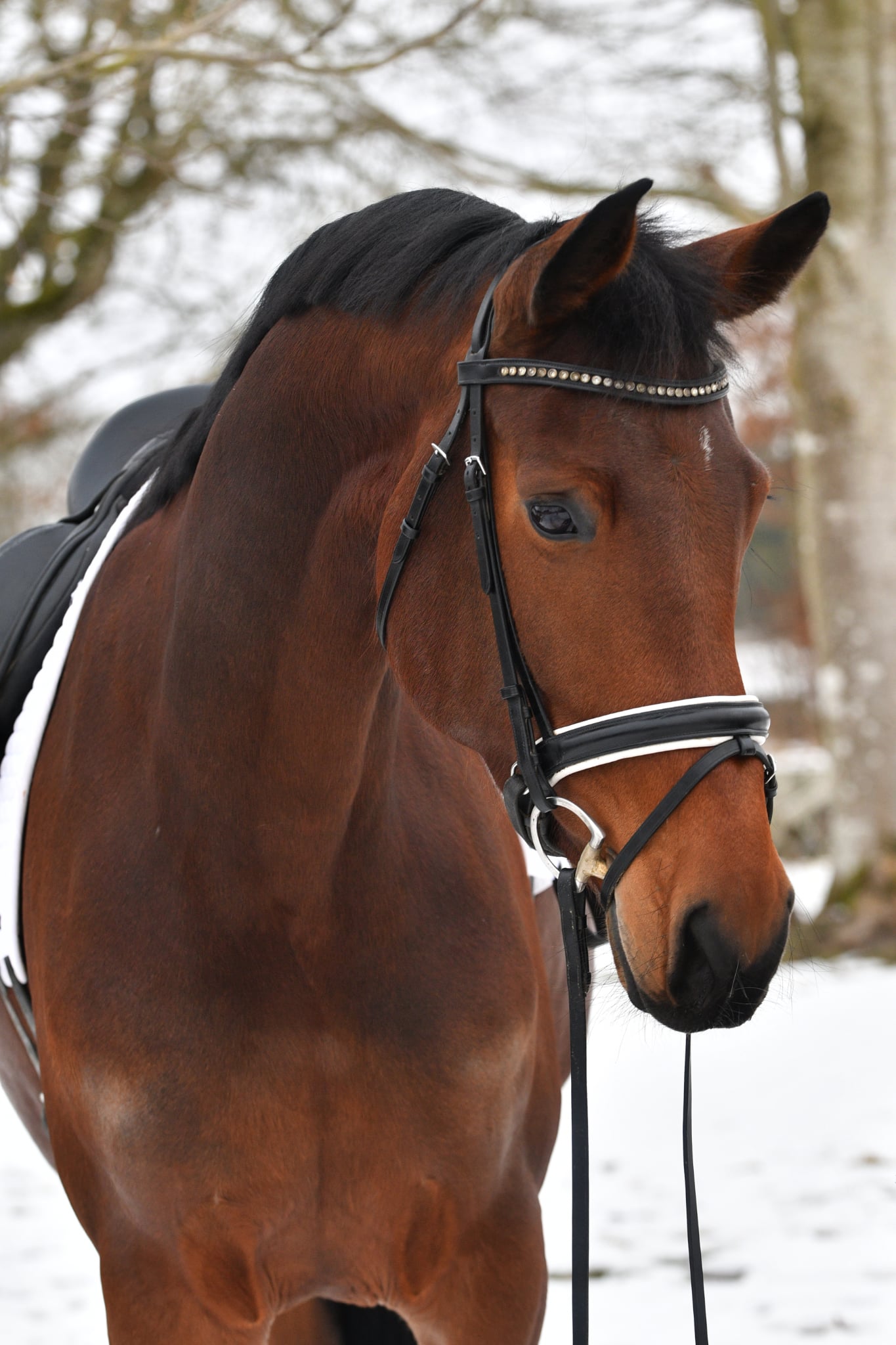 Cassiopeia is a positive mare who, with a nice expression and correct format, moves smoothly and willingly for her rider. She possesses a high level of rideability, which makes her particularly appealing for the rider who is ready to train his or her own future best friend and show partner.